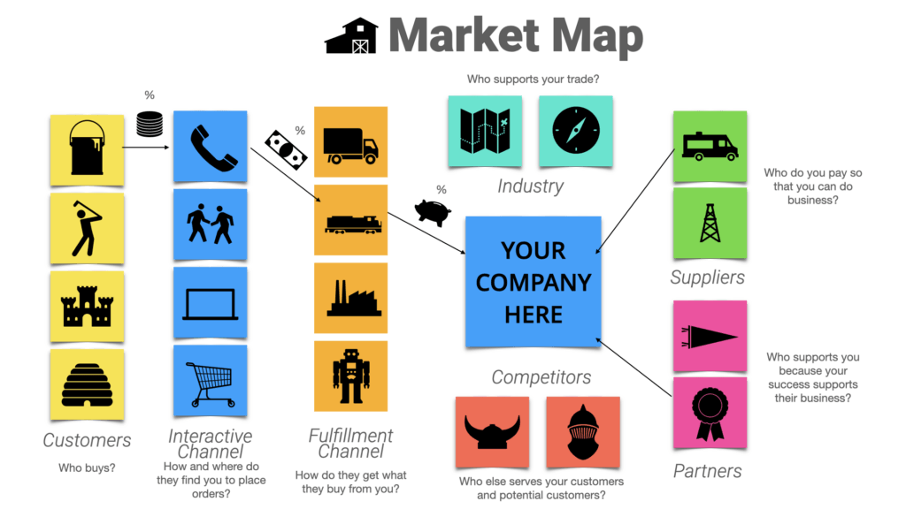 Creating a market map and competition map is one tactile and straightforward way to visualize your industry. This tool will help you understand your competition clearly and the opportunities and threats that can drive your strategy and decision-making. Your map is a high-level view of your interactions with different players in your marketplace.