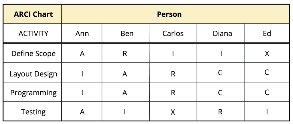 2. Clear Definition of Roles: Each role should be clearly defined. For example, if Ben is responsible for defining the project scope, he works with Anne (also responsible), while Carlos and Diana are kept in the loop (informed). Ed, marked as "x," does not need to be involved.
