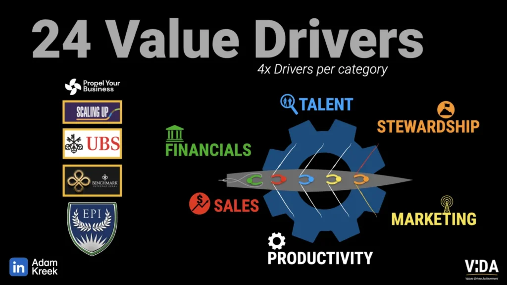 Inspired by frameworks from Propel Your Business, EPI, UBS, Benchmark and Cultivate Advisors, we’ve identified six enterprise value categories. Each includes four key drivers to stop the chaos and boost your valuation.