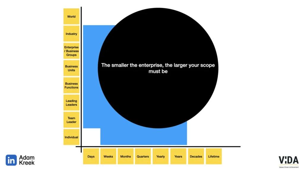 Effective strategic deployment requires leaders to operate at the correct altitude. Here’s how scope evolves as organizations grow: