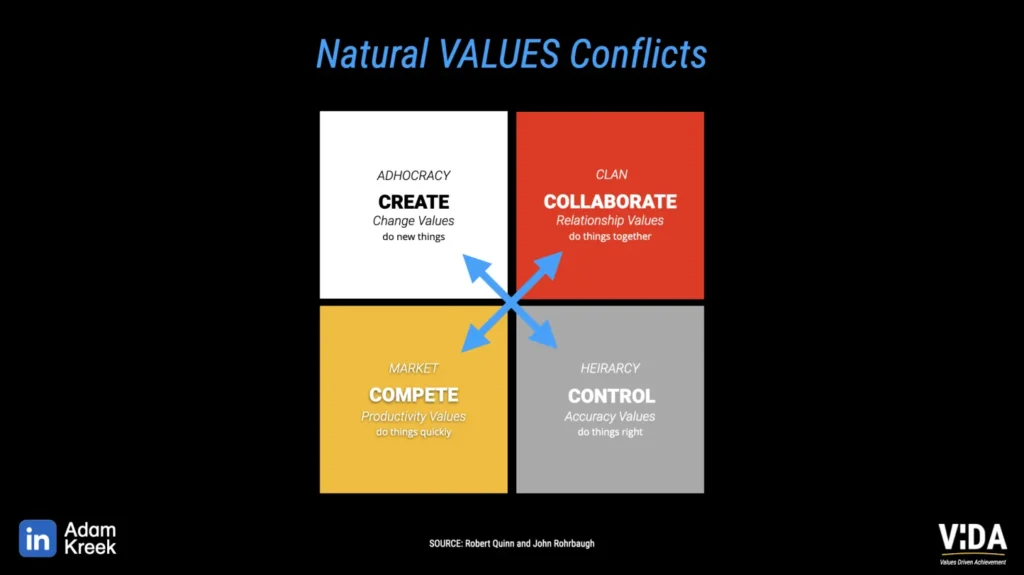 - Collaborate (internal focus + flexibility): values like teamwork, belonging, and participation.