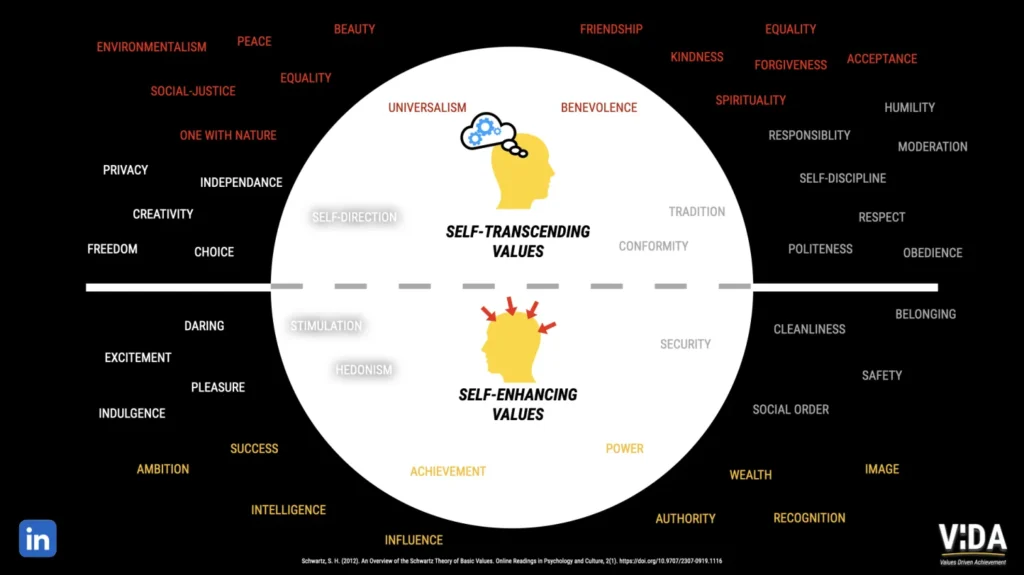 On one side, you’ll find self-transcendence values: universalism, benevolence, social justice, environmental concern. These are values that elevate others.