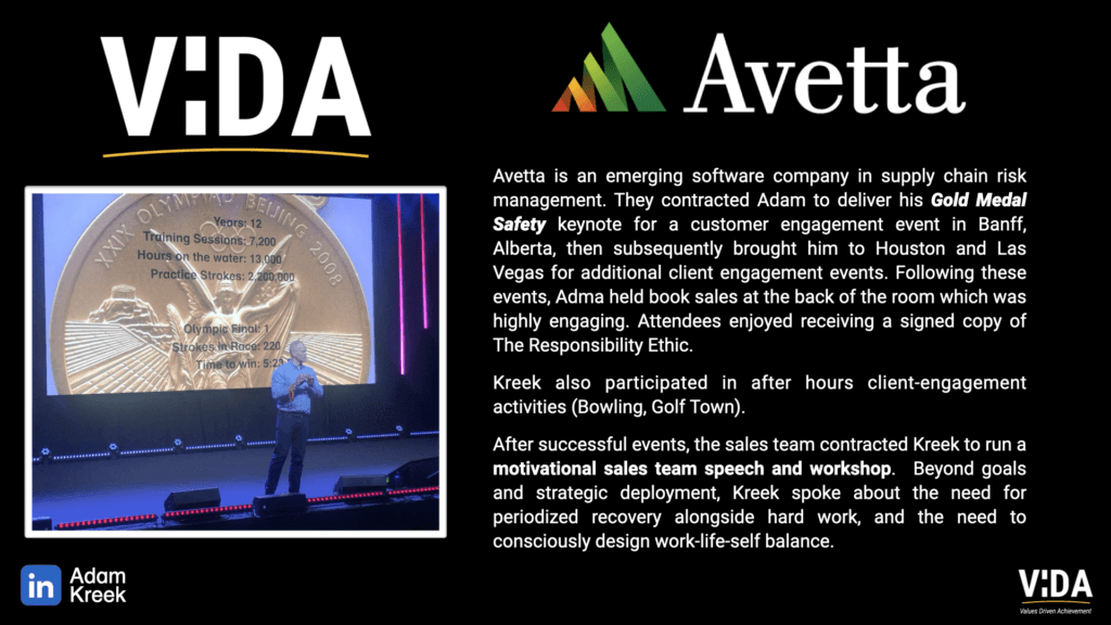 Avetta is an emerging software company in supply chain risk management. They contracted Adam to deliver his Gold Medal Safety keynote for a customer engagement event in Banff, Alberta, and then subsequently brought him to Houston and Las Vegas for additional client engagement events. Following these events, Adam held book sales at the back of the room, which was highly engaging. Attendees enjoyed receiving a signed copy of The Responsibility Ethic.