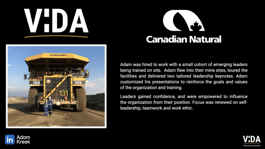 Adam was hired to work with a small cohort of emerging leaders being trained on-site. Adam flew into their mine sites, toured the facilities and delivered two tailored leadership keynotes. Adam customized his presentations to reinforce the goals and values of the organization and training.