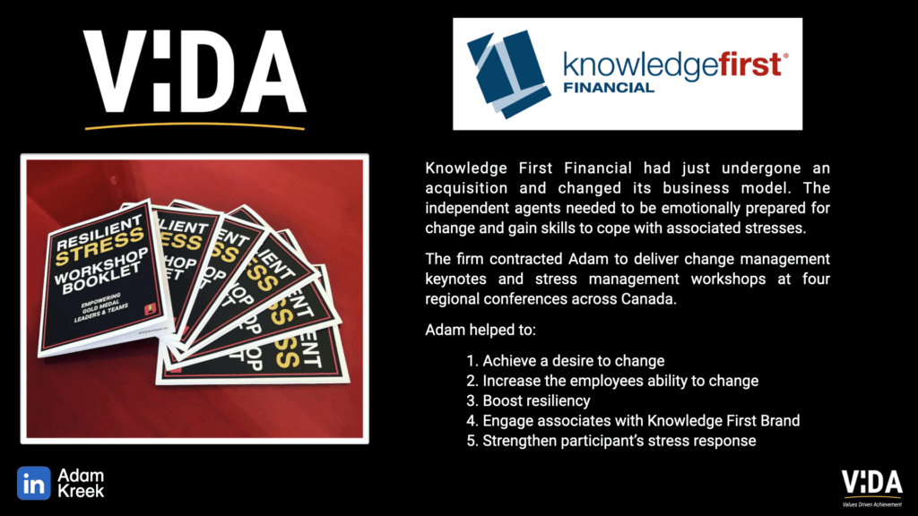 The firm contracted Adam to deliver story-driven change management keynotes and tool-filled stress management workshops at four regional conferences across Canada.